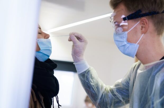 Antigentest - også kaldet kviktest - foregår med næsepodning. Fotoet her er fra SOS Internationals teststed i Aarhus. Foto: Region Midtjylland, Rune Borre-Jensen